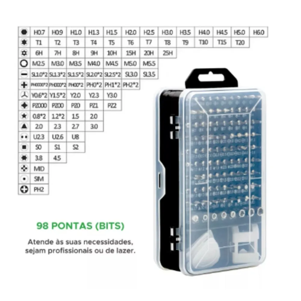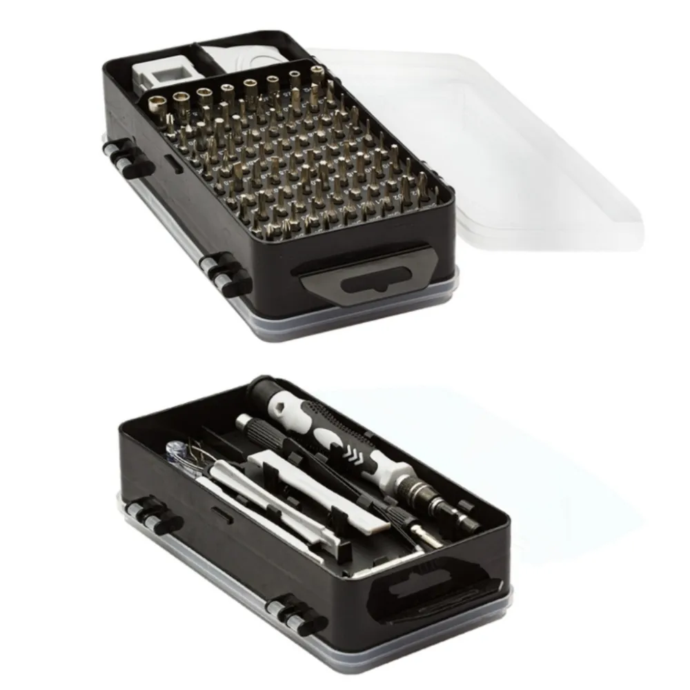 Jogo Mini Chaves Precisão Multiuso Kit Ferramenta 115 Peças é um conjunto completo de ferramentas que inclui chaves de fenda, Phillips e Torx.
