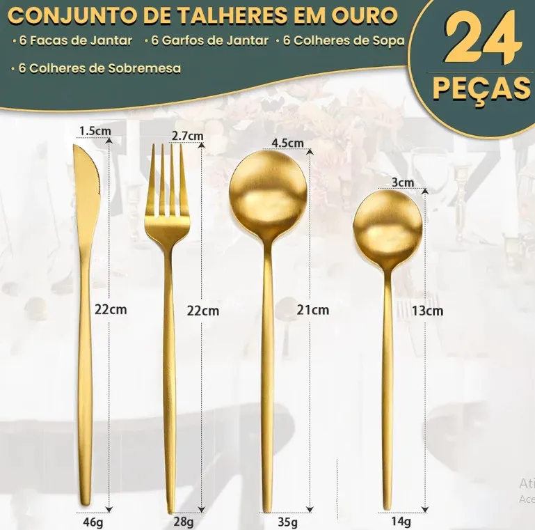 O conjunto de talheres 24 PCS inclui 6 cada: Colher de Jantar, Garfo de Jantar, Faca de Jantar, Colher de Chá.