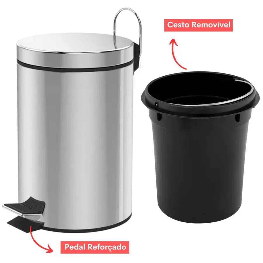 Lixeira Inox Banheiro 12 Litros Cozinha Cesto de Lixo Pedal Tampa