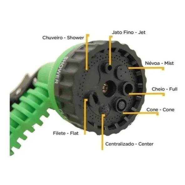 - Acompanha um gatilho com 7 tipos de jato de água: Full, cone, center, flat, shower, jet e mist