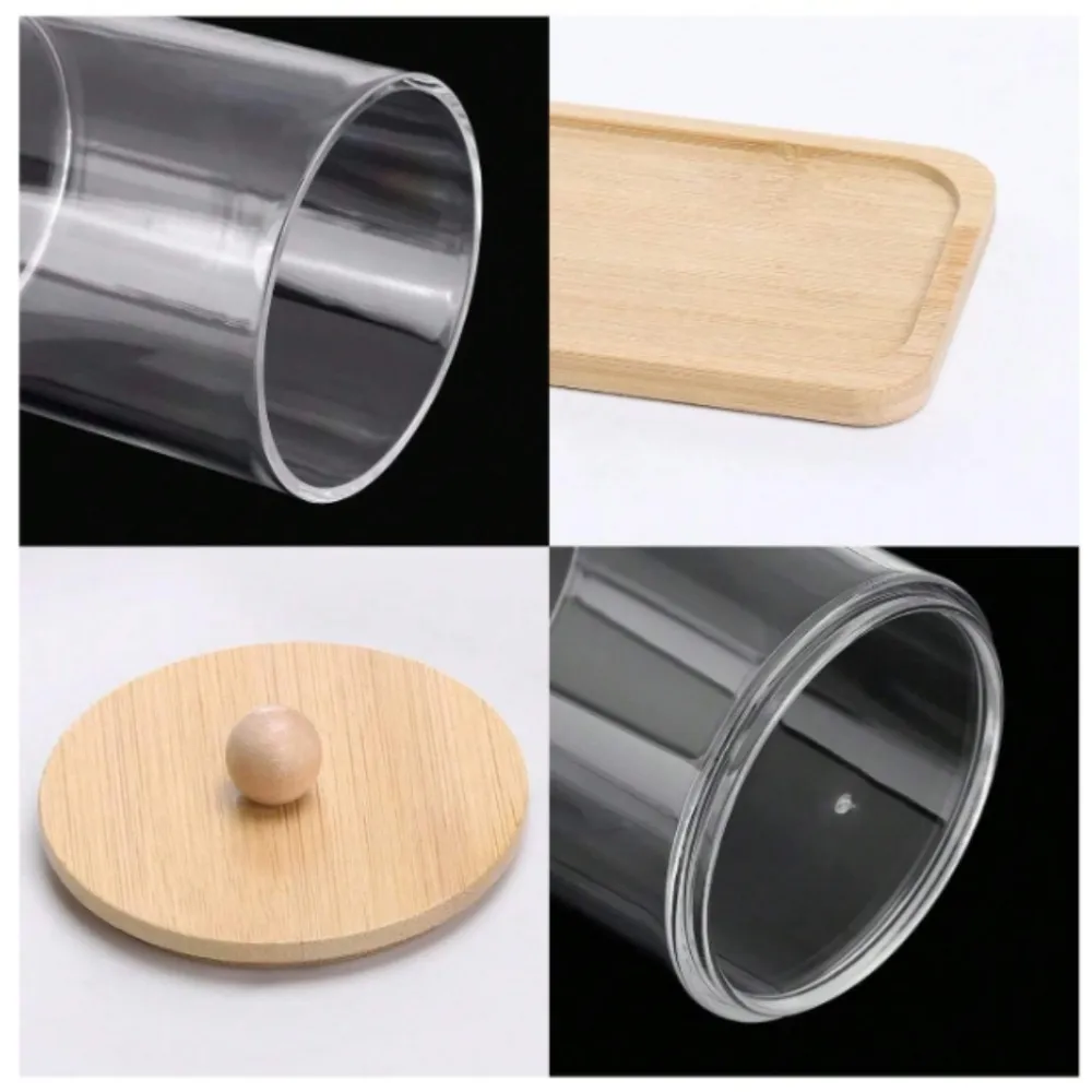 - Material: Acrílico transparente resistente com tampa de bambu.