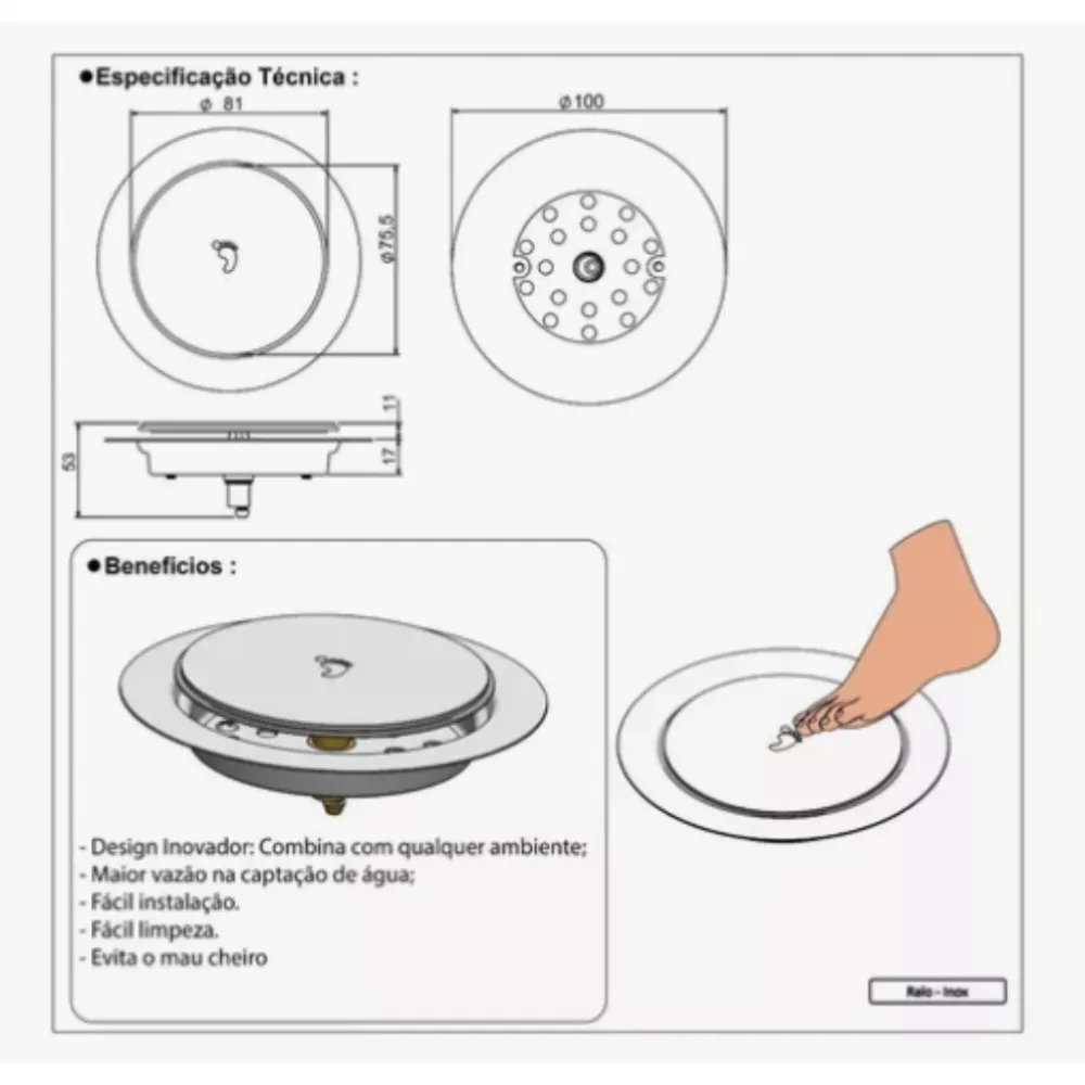 O ralo tem vedação total. Fácil instalação, composto em aço inox material de altíssima qualidade e muito resistente (resistente a corrosão).