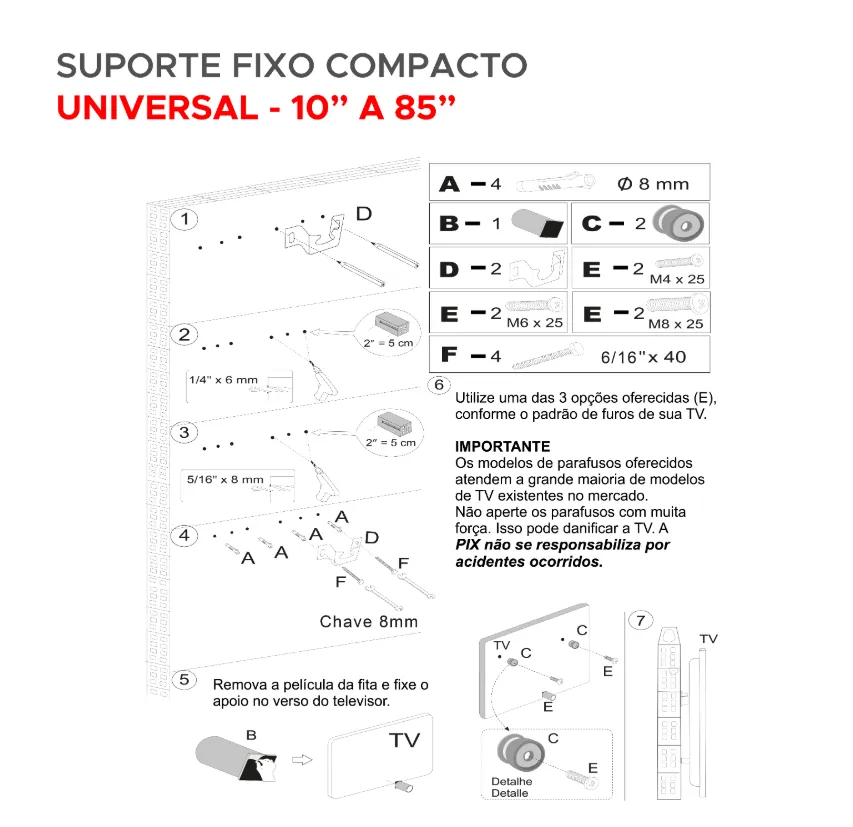 O suporte fixo para TV apresenta um design elegante e discreto, que combina com qualquer decoração de ambientes. Sua estrutura foi desenvolvida para garantir compatibilidade com uma ampla variedade de televisores disponíveis no mercado, atendendo a diversas marcas e modelos. A capacidade de acomodar TVs de 10 a 71 polegadas torna-o adequado para diferentes necessidades, desde telas menores em quartos e escritórios até televisores maiores em salas de estar e home theaters.