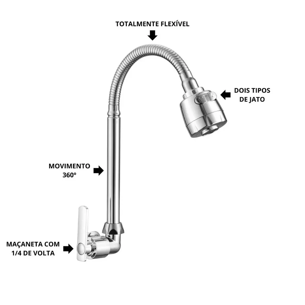 A torneira de cozinha gourmet é fabricada em metal cromado e possui a instalação na bancada ou parede, dependendo do modelo escolhido. Tem arejador com regulagem proporcionando dois tipos de jatos que podem ser alterados de acordo com a sua necessidade (chuveiro ou contínuo). Fabricado em metal cromado, possui mecanismo com abertura e fechamento 1/4 de volta, gerando mais economia e conforto ao manusear. Sua bica é flexível e rígida, fabricada em aço inoxidável, podendo flexioná-la para alterar a regulagem de uso, desta forma tornando um produto bem versátil para as necessidades diárias.